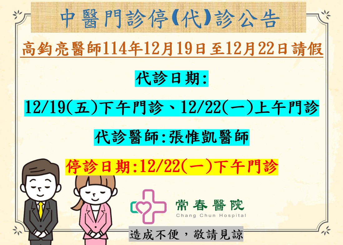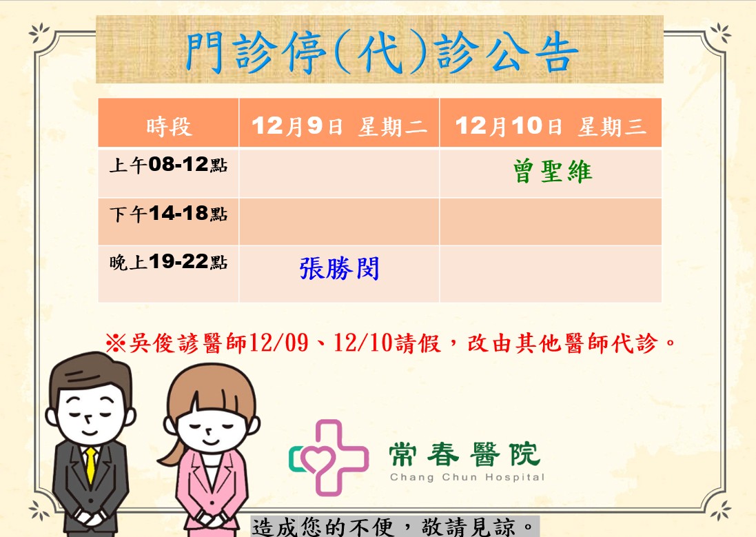吳俊諺醫師請假1141209至1210請假,改由其他醫師代診