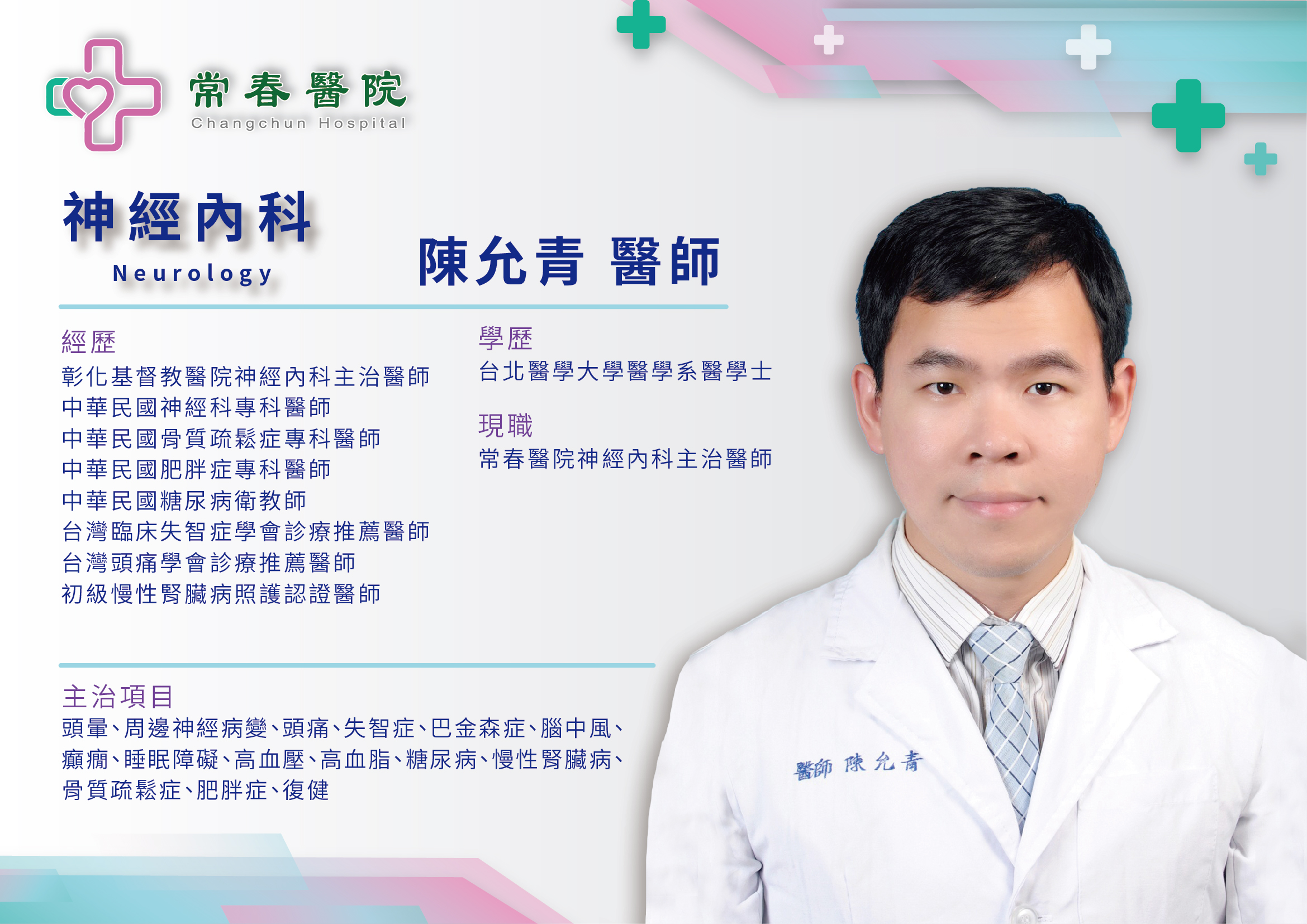掛號 主治項目 頭暈、周邊神經病變、頭痛、失智症、巴金森症、腦中風、癲癇、睡眠障礙、高血壓、高血脂、糖尿病、慢性腎臟病、骨質疏鬆症、肥胖症、復健 現任 常春醫院神經內科主治醫師 學歷 台北醫學大學醫學系醫學士 經歷 彰化基督教醫院神經內科主治醫師中華民國神經科專科醫師中華民國骨質疏鬆症專科醫師中華民國肥胖症專科醫師中華民國糖尿病衛教師台灣頭痛學會診療推薦醫師台灣臨床失智症學會診療推薦醫師初級慢性腎臟病照護認證醫師