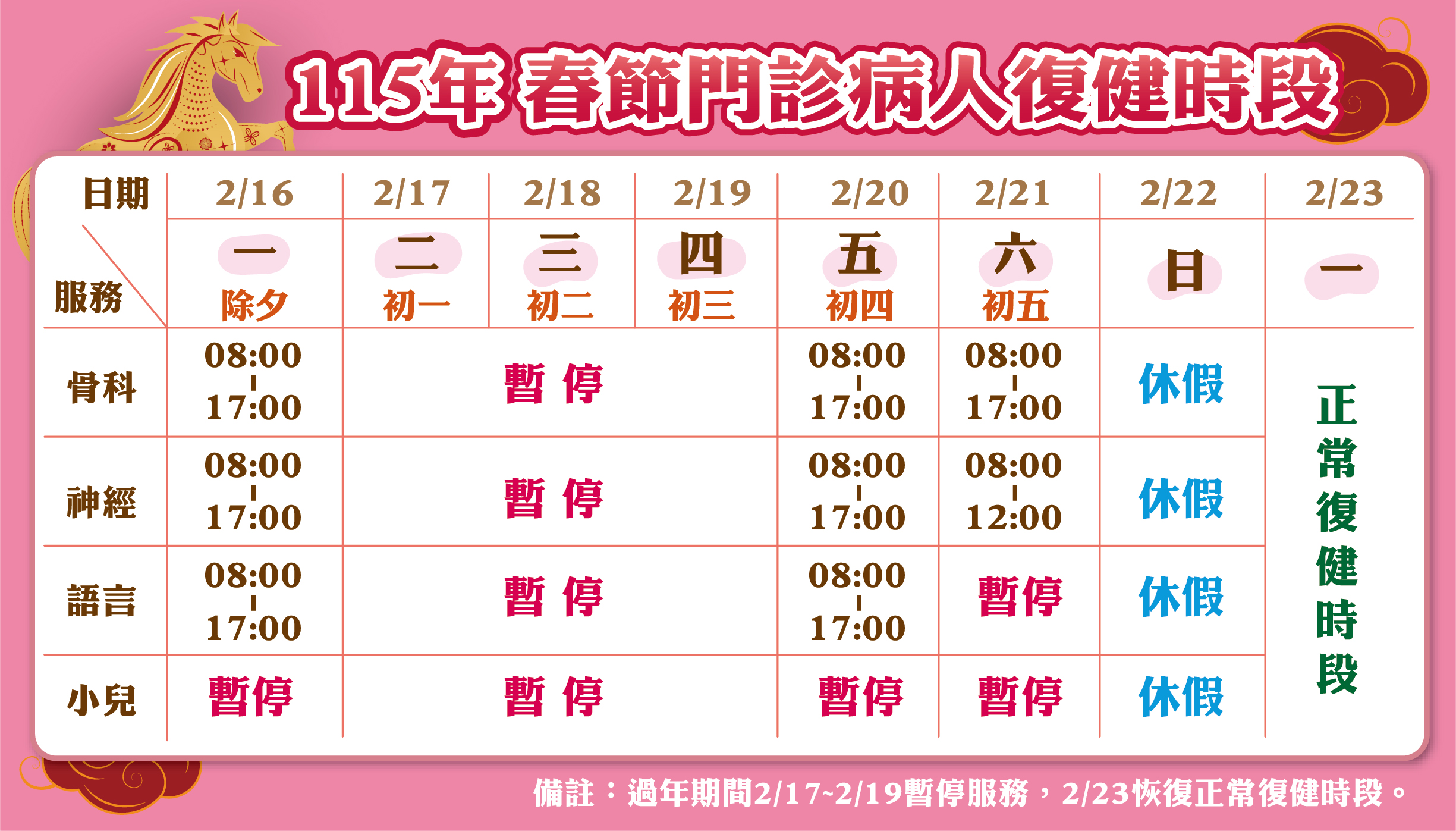 115年春節門診病人復健時段